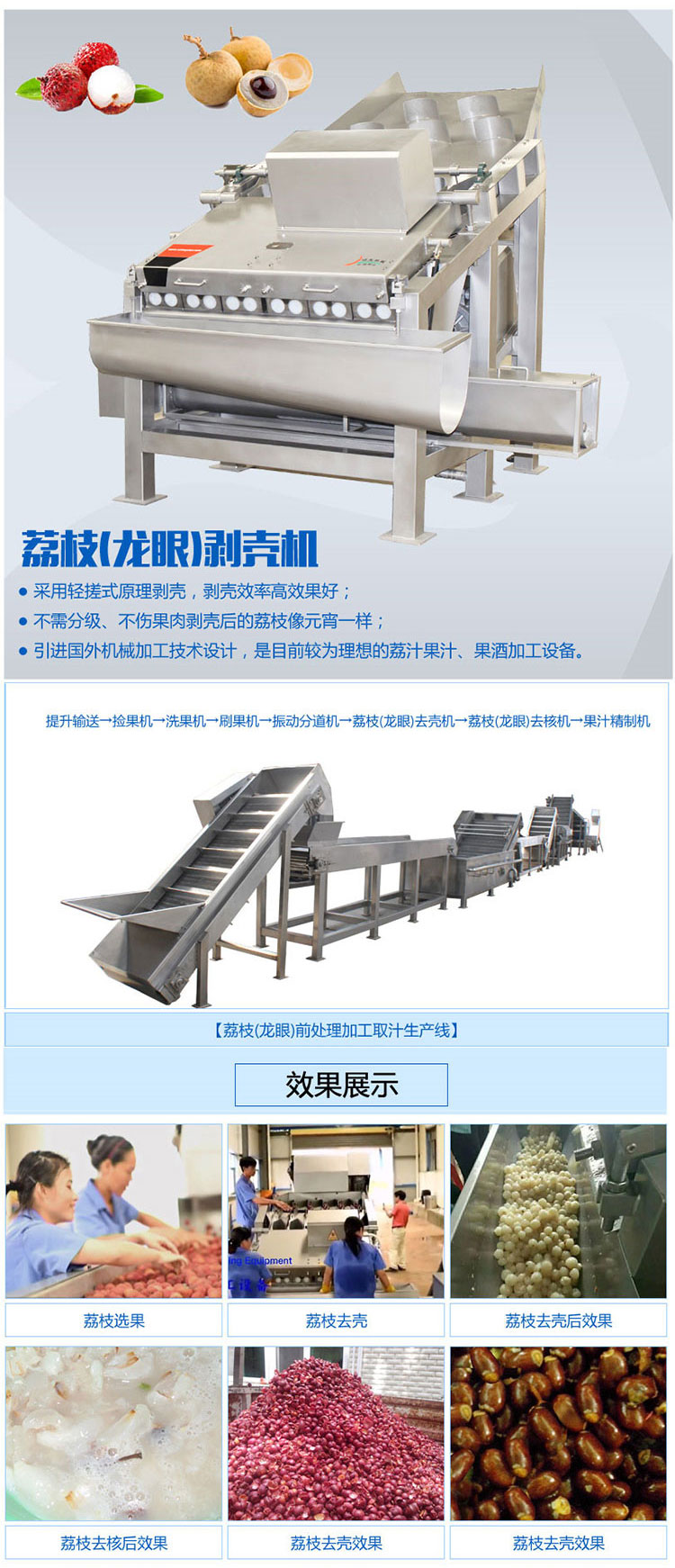 河南荔枝剥壳机适用于荔枝酒以及荔枝饮品前期处理,只有经过剥壳之后的荔枝才可以投入生产。该设备主要的功能是将荔枝进行去梗,清洗,消毒的过程,经过设备的处理,可以实现荔枝的果皮和果肉的分离。